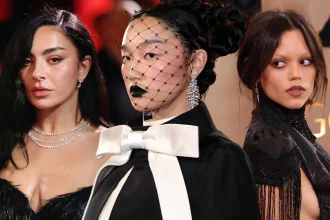 2026 оны Golden Globe Awards-ын улаан хивсэн дээр уламжлалт гялалзсан даашинз бус бараан өнгө, драматик хэлбэр бүхий готик хэв маяг…