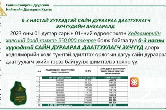 2023 оны нэгдүгээр сарын 1-ний өдрөөс хөдөлмөрийн хөлсний доод хэмжээ 550 мянган төгрөг болж өөрчлөгдсөнтэй холбоотойгоор 0-3 насны хүүхэдтэй, сайн дураараа даатгуулагч…