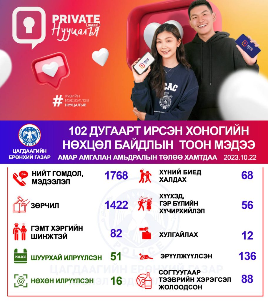 Ангилалгүй Өнгөрсөн шөнө согтуугаар тээврийн хэрэгсэл жолоодсон 88 зөрчил бүртгэгджээ Мөнхсолонго Мөнхбат 2023-10-23 0 минут уншина Share Цагдаагийн байгууллагын 102 тусгай дугаарт 2023 оны 10 дугаар сарын 22-ны өдөр нийт 1768 дуудлага, мэдээлэл бүртгэгдсэнээс зөрчлийн шинжтэй 1422, гэмт хэргийн шинжтэй 82 дуудлага, мэдээлэл бүртгэгджээ. TAGGED:jijig Түгээх Facebook Email Copy Link Print