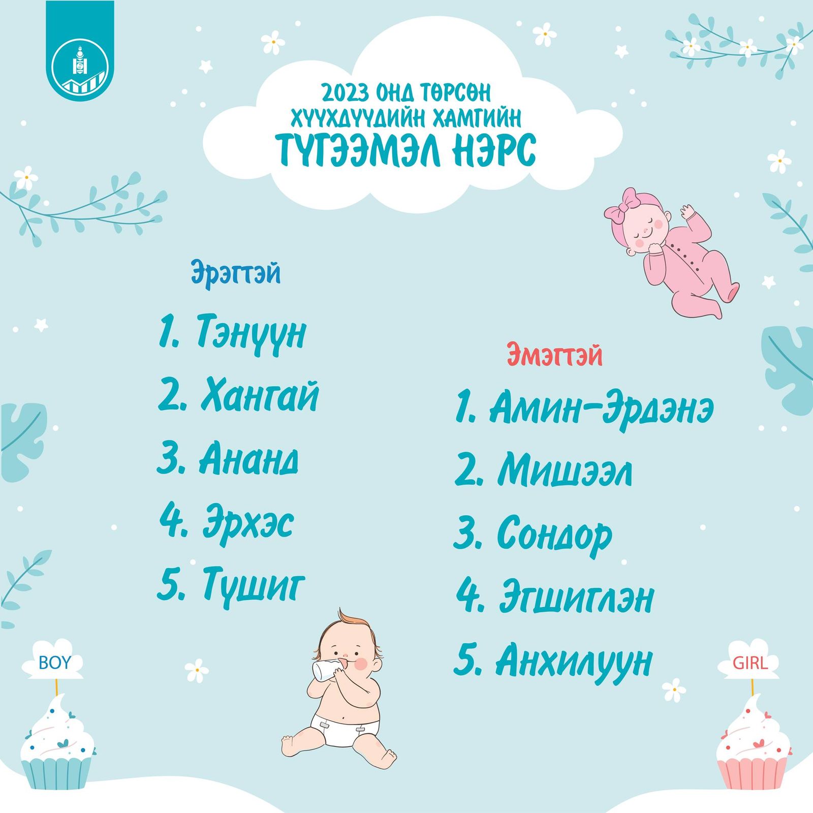 Монгол Улсад 2023 онд төрсөн хүүхдүүдийн хамгийн түгээмэл нэрийг Үндэсний статистикийн хорооноос танилцуулжээ. Эрэгтэй хүүхдэд Тэнүүн, Хангай, Ананд, Эрхэс, Түшиг хэмээх нэр түгээмэл байсан болэмэгтэй хүүхдэд Амин-Эрдэнэ, Мишээл, Сондор, Эгшиглэн, Анхилуун нэрийг их өгсөн байна.