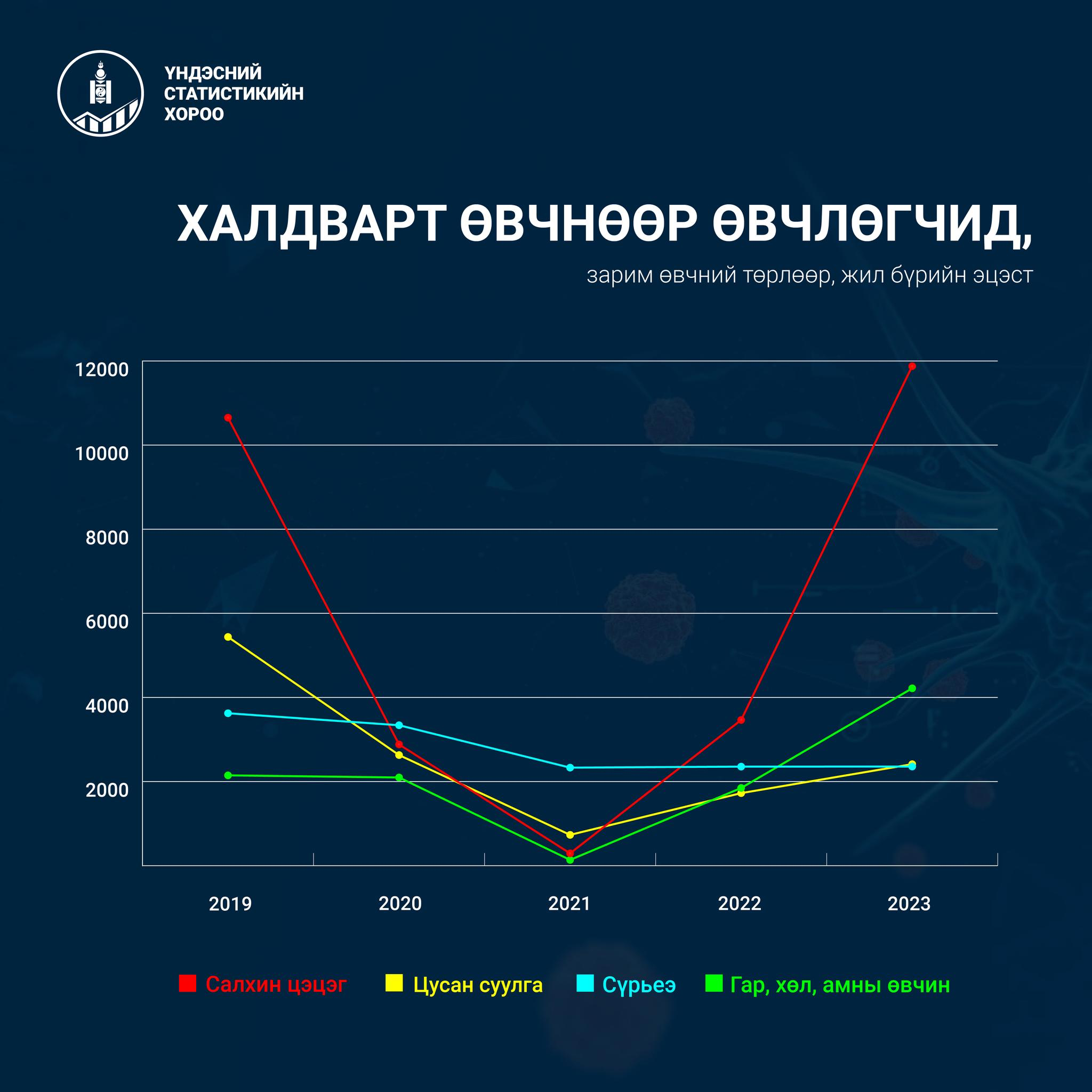 2023 оны байдлаар салхин цэцгээр өвчлөгчид 11,878-д хүрч өмнөх оноос 3.4 дахин их. Гар, хөл, амны өвчнөөр өвчлөгчид 4217 хүрч 2.3 дахин нэмэгджээ.