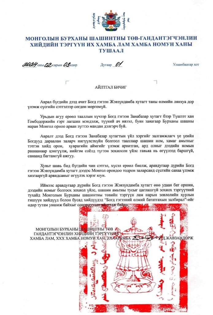 Гандантэгчэнлин хийдийн Тэргүүн их хамба, Хамба Номун хан, гэвш лхаарамба Д.Жавзандорж тушаал буулгажээ. Тэрбээр Монголын бурхны шашинтны төвийн тэргүүн лам нарын зөвлөлийн гишүүн хийдүүдэд X Богд Жэвзүндамба хутагтын шүтээн дүрийг залж, нийт дацан хийдүүдэд “Богд Гэгээний өлмий бататгахын залбирал”-ыг өдөр тутам уншихыг уриалсан байна.