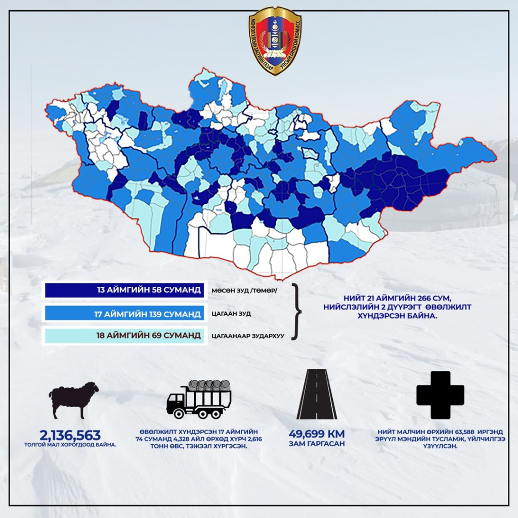 УОК-оос зудын нөхцөл байдлын талаар ээлжит мэдээллээ олон нийтэд хүргэв. Зудын нөхцөл байдлыг арав хоног тутам шинээр гаргаж байгаа бөгөөд хамгийн сүүлд II/20-нд гаргасан мэдээгээр 13 аймгийн 58 суманд төмөр буюу шилэн зудтай, 17 аймгийн 139 сум цагаан зудтай, 18 аймгийн 69 суманд цагаанаар зудархуу нөхцөл байдалтай. Нийт 21 аймгийн 266 сум, нийслэлийн хоёр дүүрэг зудын байдалд орж, нийт мал сүргийн 3.1 хувийн хорогдолтой байна.