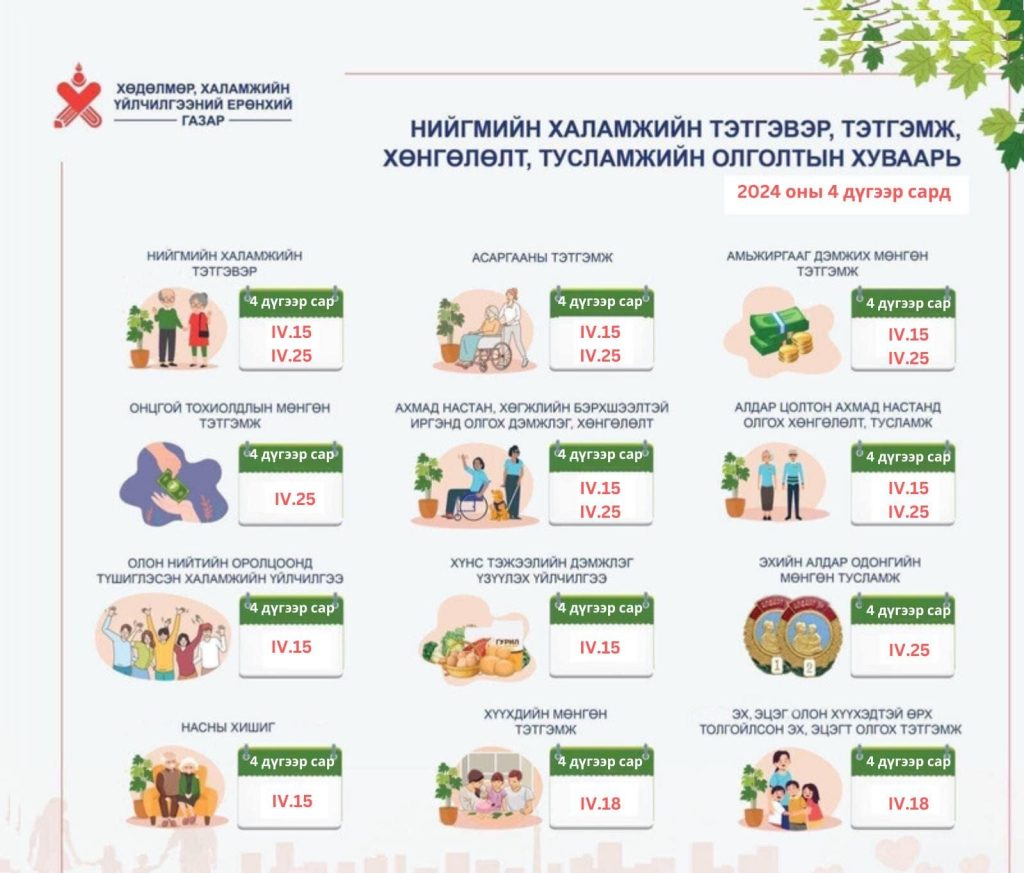 Энэ сард нийгмийн халамжийн тэтгэвэр, тэтгэмж, хөнгөлөлт тусламжийг олгох хуваарь гарчээ. Ахмад настны тэтгэвэр гээд 12 төрлийн тэтгэвэр, тэтгэмжээс наймыг дөрөвдүгээр сарын 15-наас олгох бол бусдыг 18-25-нд өгөх хуваарьтай байна. Тухайлбал, хүүхдийн 100 мянган төгрөгийн тэтгэмжийг дөрөвдүгээр сарын 18-нд дансанд нь шилжүүлнэ.
