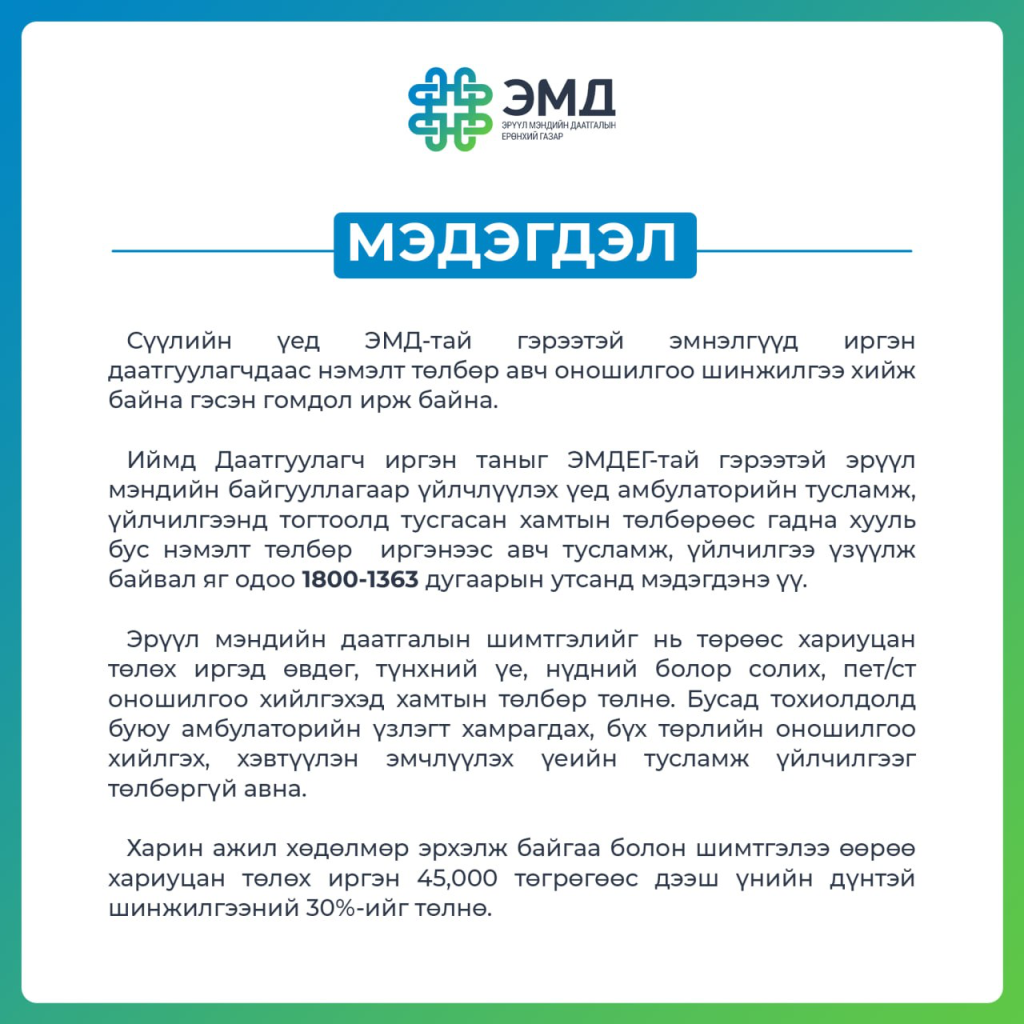 Даатгуулагч иргэн ЭМДЕГ-тай гэрээтэй ЭМБ-аар эмчлүүлэх үед өвчний түүхэнд бичигдсэн эм, тариа, эмнэлгийн хэрэгсэл гаднаас авчруулсан, нэмэлт төлбөр авсан тохиолдолдлууд гарч байгаа гомдлыг 1800-1363 утсанд мэдэгдэнэ үү гэж ЭМДЕГ-аас мэдэгдэл гаргажээ.