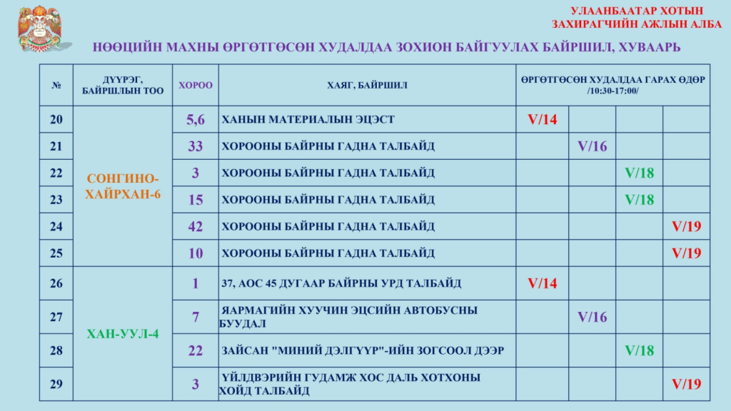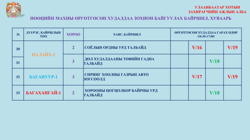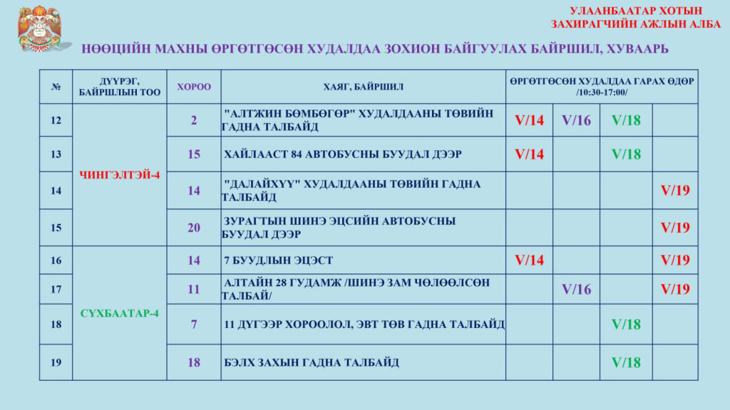 Нөөцөлсөн махыг өнгөрсөн гуравдугаар сарын 11-ний өдрөөс есөн дүүргийн 375 хүнсний дэлгүүрээр худалдаалж буй. Нөөцийн махны эрэлт хэрэгцээнд тулгуурлан нэмэлтээр долоо хоног бүр хуваарийн дагуу өргөтгөсөн худалдааг зохион байгуулж байгаа юм. Энэ долоо хоногт дараах 33 байршилд өргөтгөсөн худалдаа болно.