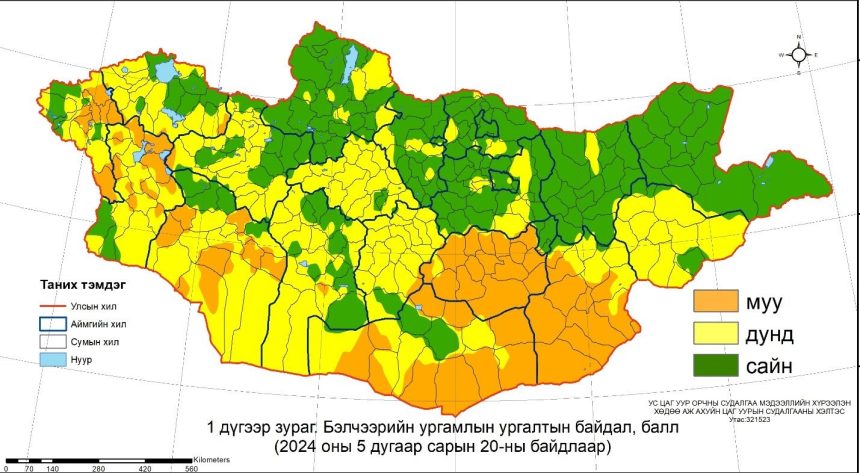 Бэлчээрийн ургамлын ургалтын байдал 5 дугаар сарын 20-ны байдлаар Дундговийн нийт, Өмнөговь, Дорноговийн ихэнх, Баян-Өлгий, Ховд, Говь-Алтайн зарим сумдын нутгаар муу, Орхон, Дархан-Уул, Дорнодын нийт, Хөвсгөл, Хэнтий, Булган, Сэлэнгэ, Төвийн ихэнх, Увс, Завхан, Баянхонгорын зарим, Өвөрхангай, Өмнөговийн цөөн сумдын нутгаар хэвийн, бусад нутгаар дунд байна.