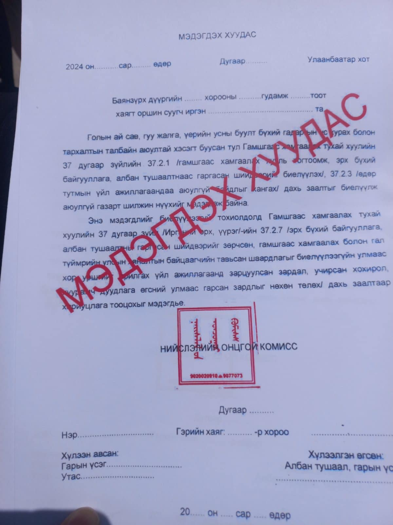 Энэ чиглэлээр нийслэлийн Онцгой байдлын газар, нийслэлийн Газар зохион байгуулалтын алба, Баянзүрх дүүргийн Засаг Даргын Тамгын газар хамтран тус дүүргийн 21, 27, 29 дүгээр хорооны үерийн аюултай бүсэд зөвшөөрөлтэй болон зөвшөөрөлгүй суурьшсан айл өрхүүдэд мэдэгдэх хуудас хүргүүлж байна.