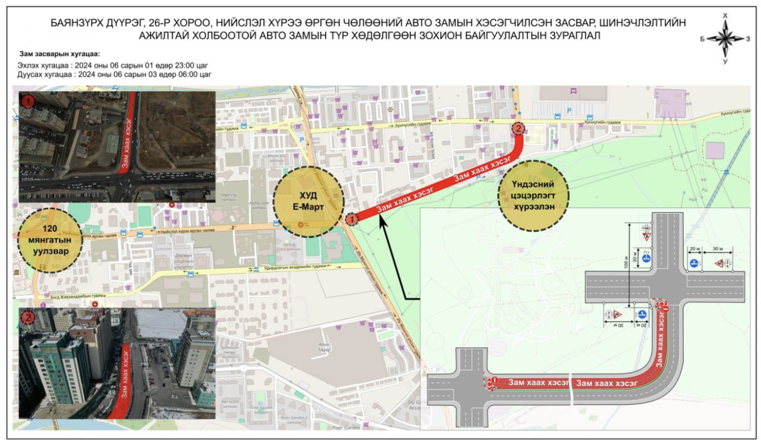 2024 оны зургаадугаар сарын 6-ны өдрийн 06.00 цагийн хооронд хааж авто замын хэсэгчилсэн засвар, шинэчлэлтийн ажлыг хийж гүйцэтгэх талаар Нийслэлийн Замын хөгжлийн газраас мэдээллээ.