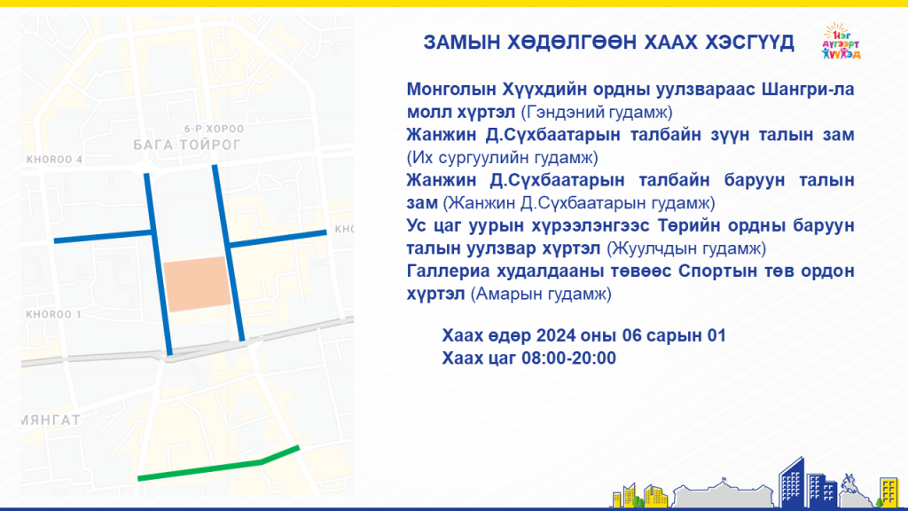 Мөн Олон улсын хүүхдийн эрхийг хамгаалах өдрийг тохиолдуулан нийслэлийн Засаг даргын захирамжийн дагуу зургаадугаар сарын 1-ний өдөр дараах чиглэлийн авто замын хөдөлгөөнийг хязгаарлана. Иймд жолооч та бүхэн явах чиглэлээ сайтар төлөвлөж, замын хөдөлгөөнд соёлтой оролцоно уу!