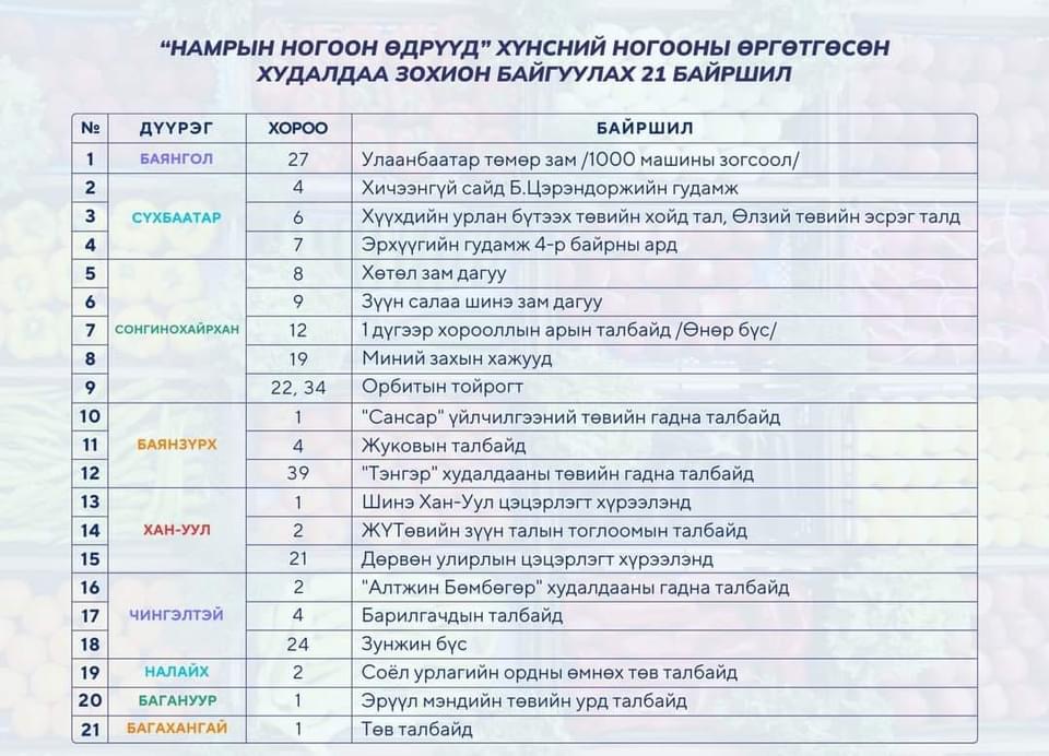 Нийслэлийн хүн амыг эх орны хөрсөнд ургасан төмс, хүнсний ногоогоор хангах, нөөцлөх, нөөшлөх боломжийг бий болгох, нийлүүлэлтийг нэмэгдүүлэх зорилгоор “Намрын ногоон өдрүүд” хүнсний ногооны өргөтгөсөн худалдааг 2024 оны наймдугаар сарын 1-нээс есөн дүүргийн дараах 21 байршилд зохион байгуулна.