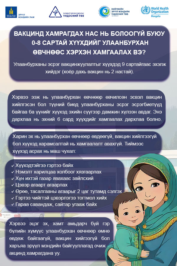 Хэрэв эцэг эх, хамт амьдарч буй гэр бүлийн хүмүүс улаанбурхан өвчнөөр өмнө өвдөж байгаагүй, вакцин хийгээгүй бол харъяа эрүүл мэндийн байгууллагад очиж вакцинд хамрагдана уу.