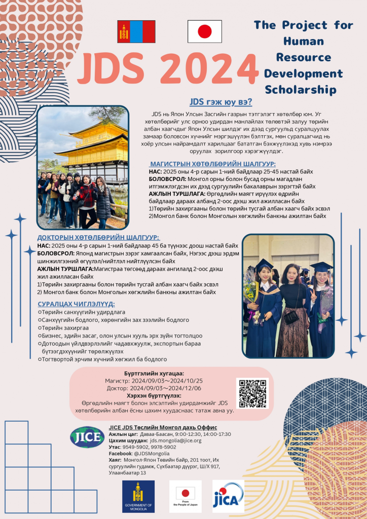 “Хүний нөөцийг хөгжүүлэх JDS тэтгэлэгт хөтөлбөр”-ийн 2024 оны бүртгэл эхэллээ. Энэ жил магистрын түвшинд 15 оюутан, докторын түвшинд нэг оюутныг сонгон шалгаруулж, Япон Улсын их сургуулиудад тус тусын мэргэжлээр англи хэл дээр суралцуулна.