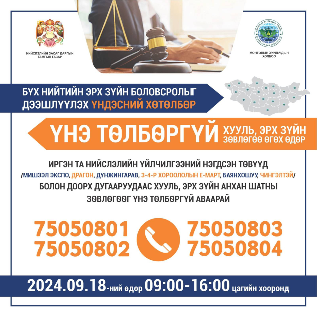 Нийслэлийн Засаг даргын Тамгын газраас Монголын Хуульчдын холбоотой хамтран иргэдэд хууль, эрх зүйн үнэ төлбөргүй зөвлөгөө өгөх өдөрлөгийг зохион байгуулдаг. Энэ сарын өдөрлөг Есдүгээр сарын 18-ны өдөр 09:00-16:00 цагийн хооронд зохион байгуулагдах бөгөөд иргэн та 75050801, 75050802, 75050803, 75050804 дугаарын утсаар холбогдож мөн Нийслэлийн Үйлчилгээний нэгдэн төвийн Дүнжингарав, Драгон, Мишээл, Сэлбэ, Баянгол, Баянхошуу салбаруудаас иргэний эрх зүй, захиргааны эрх зүй, эрүүгийн эрх зүй болон гэр бүл, гэрээний эрх зүй зэрэг сэдвээр хууль, эрх зүйн үнэ төлбөргүй зөвлөгөө, мэдээлэл авах боломжтой.