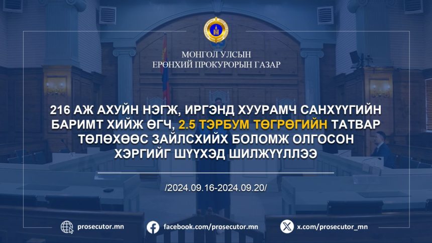 Прокурорын байгууллага 2024 оны 9 дүгээр сарын 16-наас 20-ны өдрийг хүртэл хугацаанд хэрэг бүртгэлтийн 41876, мөрдөн байцаалтын 3510 хэрэгт хяналт тавьж, мөрдөгчид тодорхой ажиллагаа гүйцэтгүүлэхээр нийт 537 даалгавар бичгээр өгч, эрүүгийн 235 хэрэгт яллах дүгнэлт үйлдэн шүүхэд шилжүүллээ.