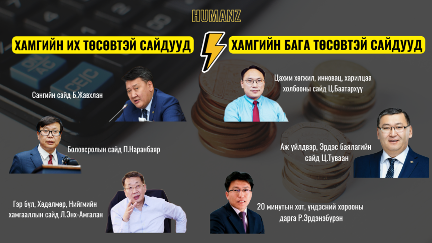 Ирэх оны улсын төсөв 33 захиран захирагчидтай бөгөөд тэднээс хамгийн их төсвийг буюу 5.7 их наядын төсвөөр Сангийн яамны сайд Б.Жавхлан бичигдэж байна. Тэгвэл үүний дараа Боловсролын яамны сайд 4.5 их наядыг ирэх жилийн ажлын багцдаа тусгуулжээ. Өмнөх онуудад дуусгаагүй сургууль, цэцэрлэгийн барилгын ажил, өргөтгөл мөн шинээр барих боловсролын байгууллагуудын ажлуудыг хийж гүйцэтгэнэ гэж тухайн яамны сайд П.Наранбаяр онцолсон юм. Улсын төсвөөс хамгийн өндөр төсөв батлуулсан сайдуудын гуравдугаарт Гэр бүл, Хөдөлмөр, Нийгмийн хамгааллын яамны сайд Л.Энх-Амгалан бичигдэж байна. Тэрбээр 4.5 их наядыг ирэх оны ажлын багцдаа захиран зарцуулах юм.