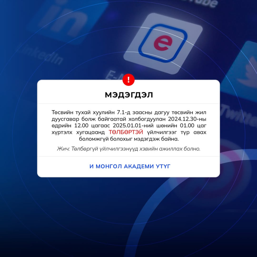 Төсвийн тухай хуулийн 7.1-д заасны дагуу төсвийн жил дуусгавар болж байгаатай холбогдуулан 2024 оны арванхоёрдугаар сарын 30-ны өдрийн 12.00 цагаас 2025 оны нэгдүгээр сарын 01-ний 01.00 цаг хүртэлх хугацаанд ТӨЛБӨРТЭЙ үйлчилгээг түр авах боломжгүй болохыг мэдэгдэж байна.