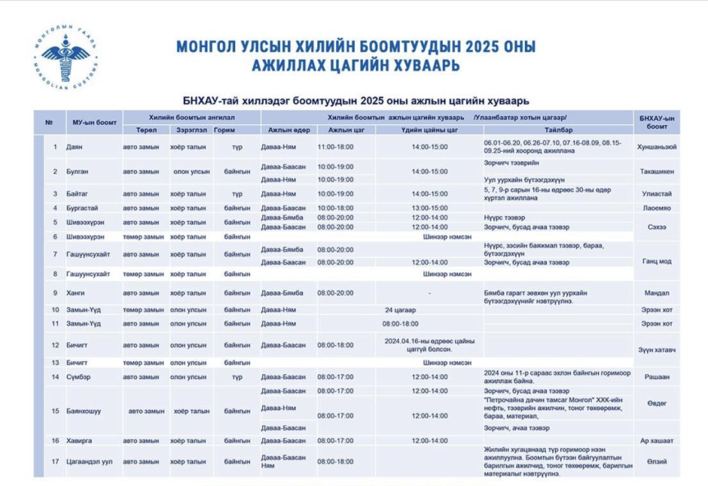 ЦАГ ҮЕ ТАНИЛЦ | Монгол Улсын хилийн боомтуудын 2025 оны ажиллах цагийн хуваарь Янжиндулам Мягмарсүрэн 2025-02-19 0 минут уншина Share Зам тээврийн яамнаас Монгол Улсын хилийн боомтуудын 2025 оны ажиллах цагийн хуваарийг танилцуулж байна. TAGGED:jijigOntsloh Түгээх Facebook Email Copy Link Print