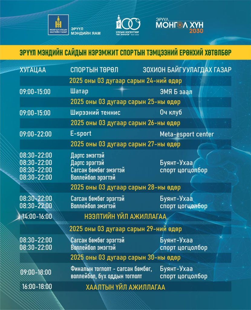 Энэхүү тэмцээнийг уламжлал болгон зохион байгуулдаг бөгөөд энэ жил “ONE HEALTH-ONE FAMILY” уриан дор УНТЭ-ийн 100 жилийн ойн хүрээнд зохион байгуулж байна. Эрүүл мэндийн салбарын эмч, мэргэжилтэн, ажилтнууд оюун ухаан, хурд хүч, авхаалж самбаа ур чадвараараа сагсан бөмбөг, волейбол, шатар, ширээний теннис, дартс, е-sport гэсэн зургаан төрөлд өрсөлдөнө. Биеийн тамир, спортоор дамжуулан хамт олны дунд аливаа тэмцээн уралдааныг зохион байгуулах нь сэтгэл, оюун болон бие бялдрыг сэргээх, идэвхтэй хөдөлгөөн, амьдралын зөв дадал хэвшлийг суулгах, хамт олны уур амьсгал, багаар ажиллах чадамжийг нэмэгдүүлэх зэрэг олон давуу талтайг судалгаагаар тогтоосон байдаг. Тэмцээн өнөөдрөөс Буянт-Ухаа спорт цогцолборт эхэлж байна. Тэмцээний хөтөлбөрийг зурган хэлбэрээр байршуулав.