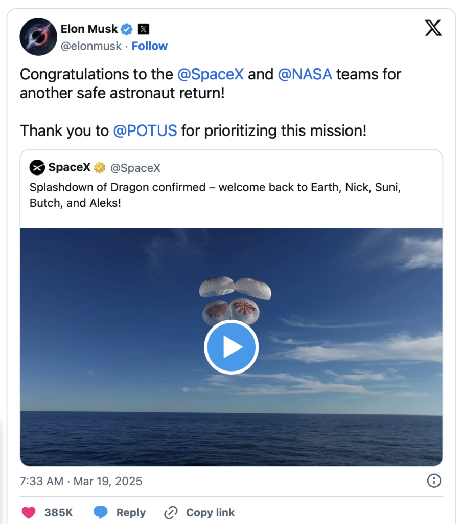 НАСА-гийн сансрын нисэгч Сунита Уильямс, Батч Вилмор нарыг Олон улсын сансрын станцад (ОУСС) есөн сар гацсаны дараа өнгөрсөн долоо хоногийн лхагва гарагт эх дэлхийдээ буцаан авчирсан нь SpaceX-ийн Dragon онгоц байв. Илон Маск X дээр хуваалцсан нийтлэлдээ багийнханд баяр хүргэж, АНУ-ын Ерөнхийлөгч Дональд Трампад энэхүү эрхэм зорилгоо чухалчилж байгаад талархал илэрхийлэв.