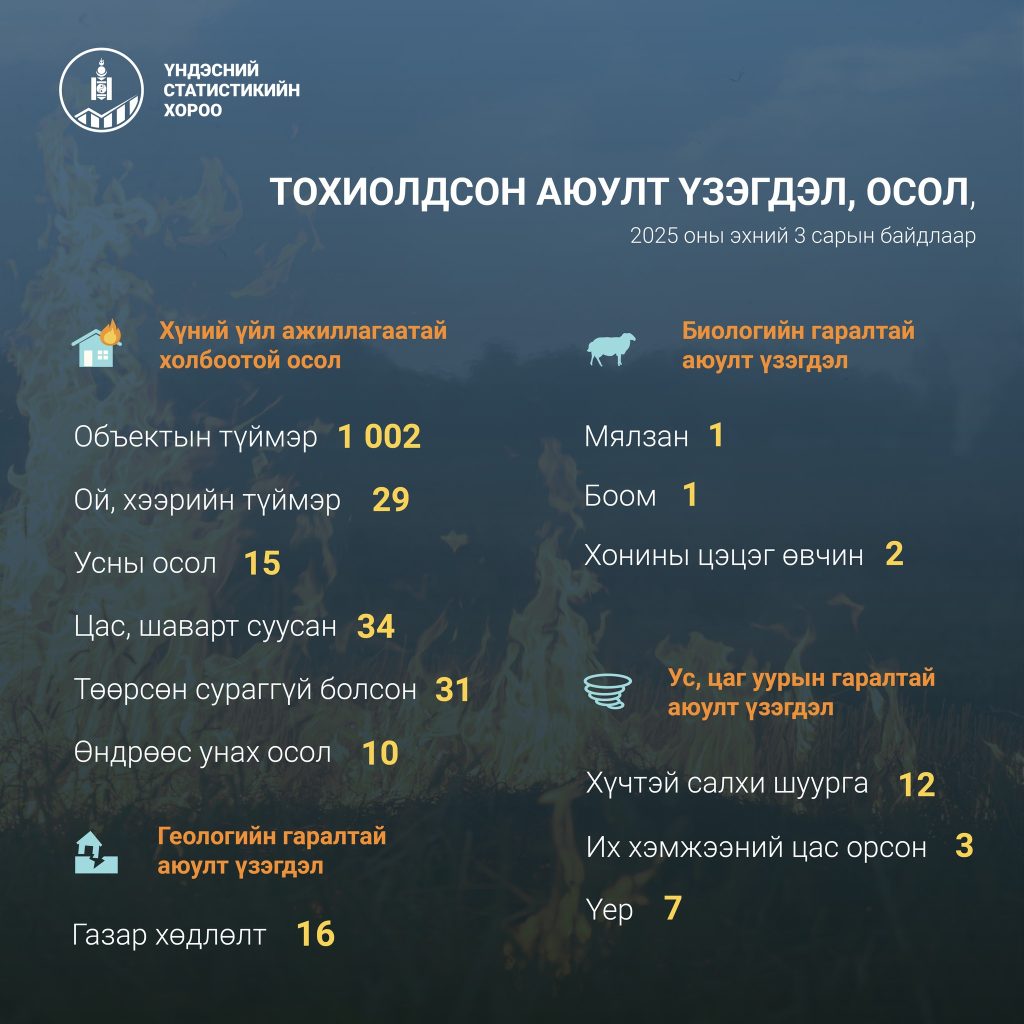 Аюулт үзэгдэл, ослын тохиолдол 2025 оны эхний гуравдугаар сард 1220 удаа бүртгэгдэж, өмнөх оны мөн үеэс 132 буюу 9.8 хувиар буурсан байна.