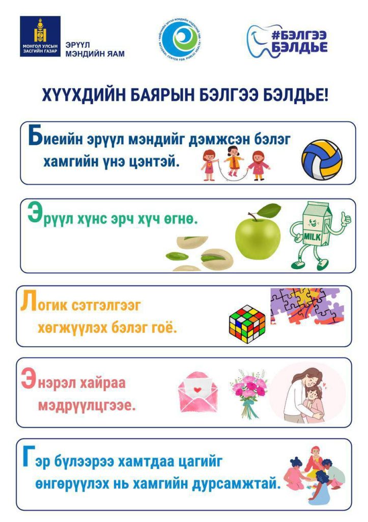 Энэ өдрийг тохиолдуулан хүүхдүүддээ эрүүл мэнд, бие бялдар, оюун ухааны хөгжлийг нь дэмжих ухаалаг сонголтыг хийж бэлгээбэлдье аяныг өрнүүлэн ажиллаж байна.