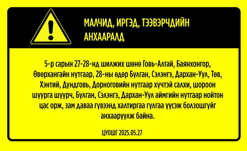 Өнөө шөнө /2025.05.27/ Говь-Алтай, Баянхонгор, Өвөрхангайн нутгаар, маргааш /2025.05.28/ Булган, Сэлэнгэ, Дархан-Уул, Төв, Хэнтий, Дундговь, Дорноговийн нутгаар хүчтэй салхи, шороон шуурга шуурч, Булган, Сэлэнгэ, Дархан-Уул аймгийн нутгаар нойтон цас орж, зам даваа гүвээнд халтиргаа гулгаа үүсэж болзошгүйг анхааруулж байна.