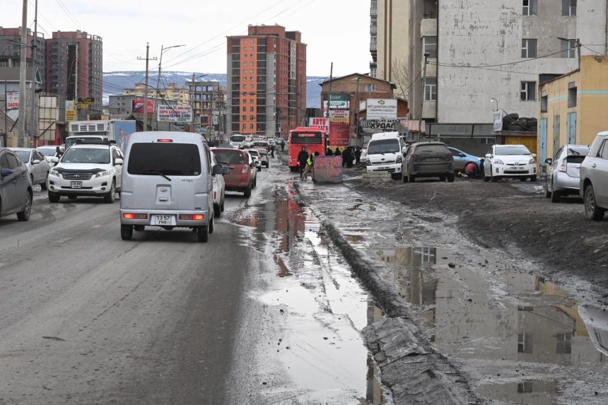 Энхтайваны өргөн чөлөө дагуух хуучирсан өнгөт хавтангуудыг шинэчилж, ус тогтдог хэсгүүдийг тэгшилж засна.