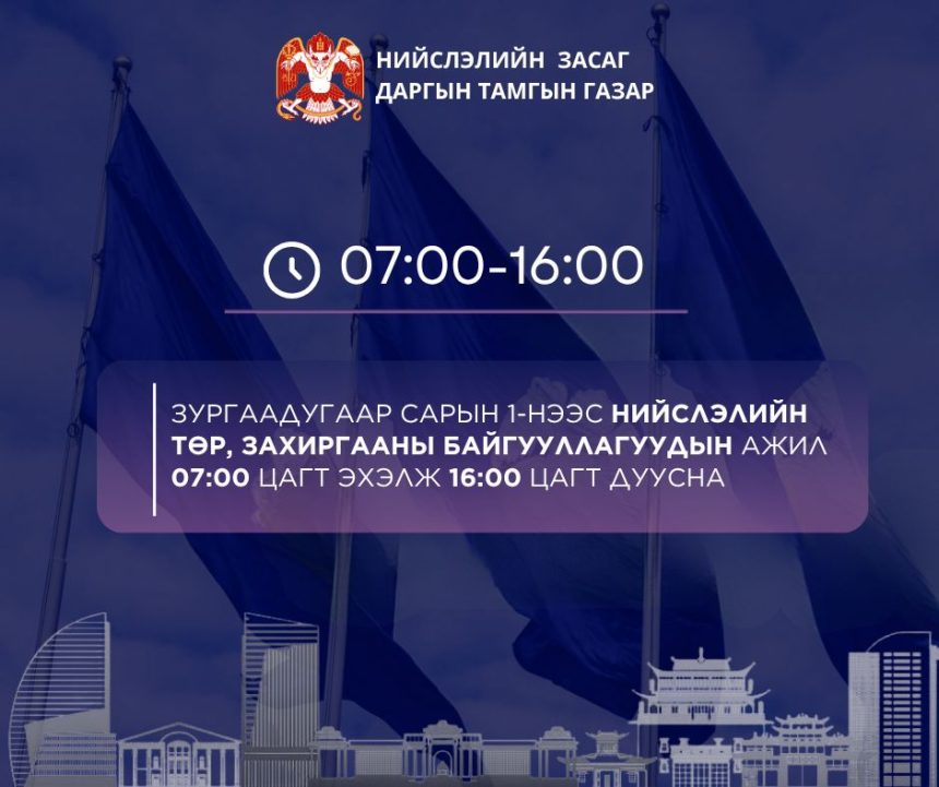 Нийслэлийн авто замын ачааллыг бууруулах, албан хаагчдын ажлын бүтээмжийг нэмэгдүүлэх, гэр бүлтэйгээ өнгөрүүлэх чөлөөт цагийг нэмэх зорилгоор НЗД-ын А/630 захирамжийн дагуу нийслэлийн төр, захиргааны байгууллагуудын ажлын цагийн хуваарьт зохицуулалт оруулж, ажлын цагийг 07:00 цагт эхлүүлж, 16 цагт тарахаар зохицуулалт хийлээ. Уг зохицуулалтт 6 дугаар сарын 1-ний өдрөөс наймдугаар сарын 31-ний өдрийг дуустал үргэлжлэх юм. Харин ирэх есдүгээр сарын 1-нээс зургаадугаар сарын 1-ний өдөр хүртэлх хугацаанд энгийн цагийн хуваарийн дагуу ажиллана.