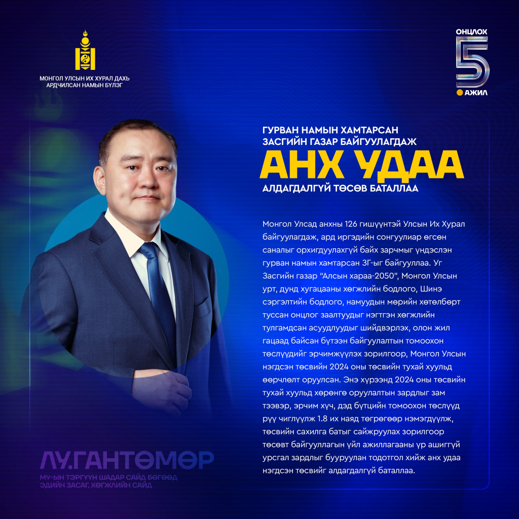 Ардчилсан намаас Хамтарсан Засгийн газрын бүрэлдэхүүнд томилогдон ажилласан Монгол Улсын Тэргүүн шадар сайд бөгөөд Эдийн засаг, хөгжлийн сайд Лу.Гантөмөрийн өнгөрсөн арван сарын хугацаанд хийж хэрэгжүүлж, эхлүүлсэн ажлаас онцлох таван ажлыг танилцууллаа.