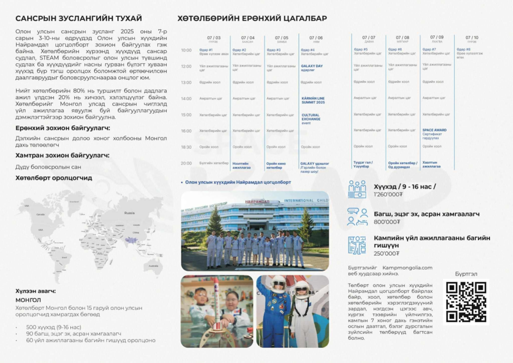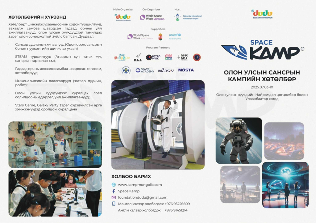 “Олон Улсын Сансрын Камп”-ийг долоодугаар сарын 3-10-ны өдрүүдэд Олон Улсын Хүүхдийн Найрамдал Цогцолборт зохион байгуулах гэж байна. Камп нь сансар судлал, STEAM боловсролыг хүүхдүүдэд олон улсын түвшинд танилцуулж, шинжлэх ухааныг сонирхолтой, бүтээлчээр суралцах боломжийг олгох ба бие даах, сорилттой нүүр тулах, шийдвэр гаргалтад чиглэсэн цогц хөтөлбөр юм. Тус арга хэмжээнд 15+ орны 500 орчим хүүхэд оролцох бөгөөд тэд соёлын болон танин мэдэхүйн олон талт үйл ажиллагаанд хамрагдана. Хөтөлбөрийн хүрээнд хүүхдийн насны онцлогт тохирсон дасгалыг боловсруулсан бөгөөд 80% туршилт, дадлагад, 20% хэлэлцүүлэг, хичээлд суурилсан хөтөлбөр байна.