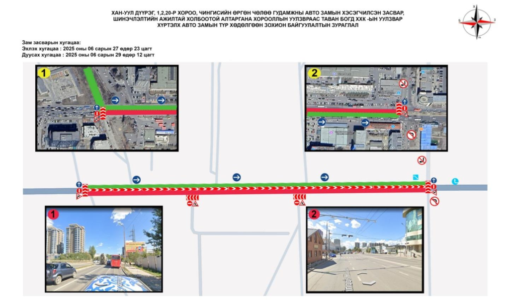 Хан-Уул дүүрэг 1, 2, 20-р хорооны нутаг дэвсгэр, Чингисийн өргөн чөлөөний хэсэгчилсэн засвар, шинэчлэлтийн ажлын хүрээнд Алтарганы уулзвараас Таван богд групп хүртэлх авто замыг хааж, шинэчилнэ.