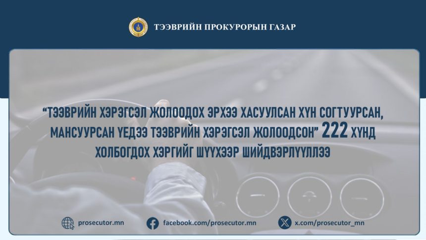 2025 оны 06 сарын 25-ны өдрийн байдлаар “Тээврийн хэрэгсэл жолоодох эрхээ хасуулсан хүн согтуурсан, мансуурсан үедээ тээврийн хэрэгсэл жолоодсон” 230 хүнд холбогдох хэргийг шүүхэд шилжүүлсэн нь өмнөх оны мөн үетэй харьцуулахад 71 хэргээр буюу 69 хувиар, 222 хүнд холбогдох хэргийг шүүхээр эцэслэн шийдвэрлүүлсэн нь 95 хэргээр буюу 57 хувиар тус тус өссөн байна.