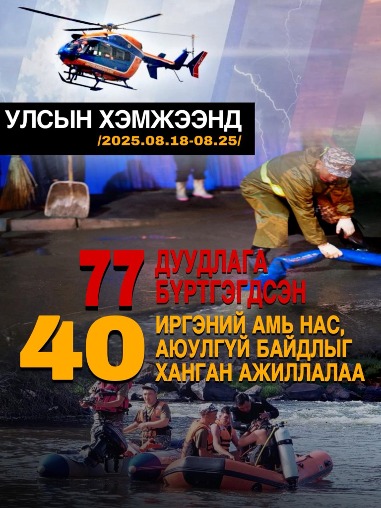 Улсын хэмжээнд өнгөрсөн долоо хоногт /2025.08.18-08.24/ нийслэлийн 7 дүүрэг, 17 аймгийн 25 суманд аюулт үзэгдэл, ослын 77 удаагийн дуудлага бүртгэгдсэн байна.