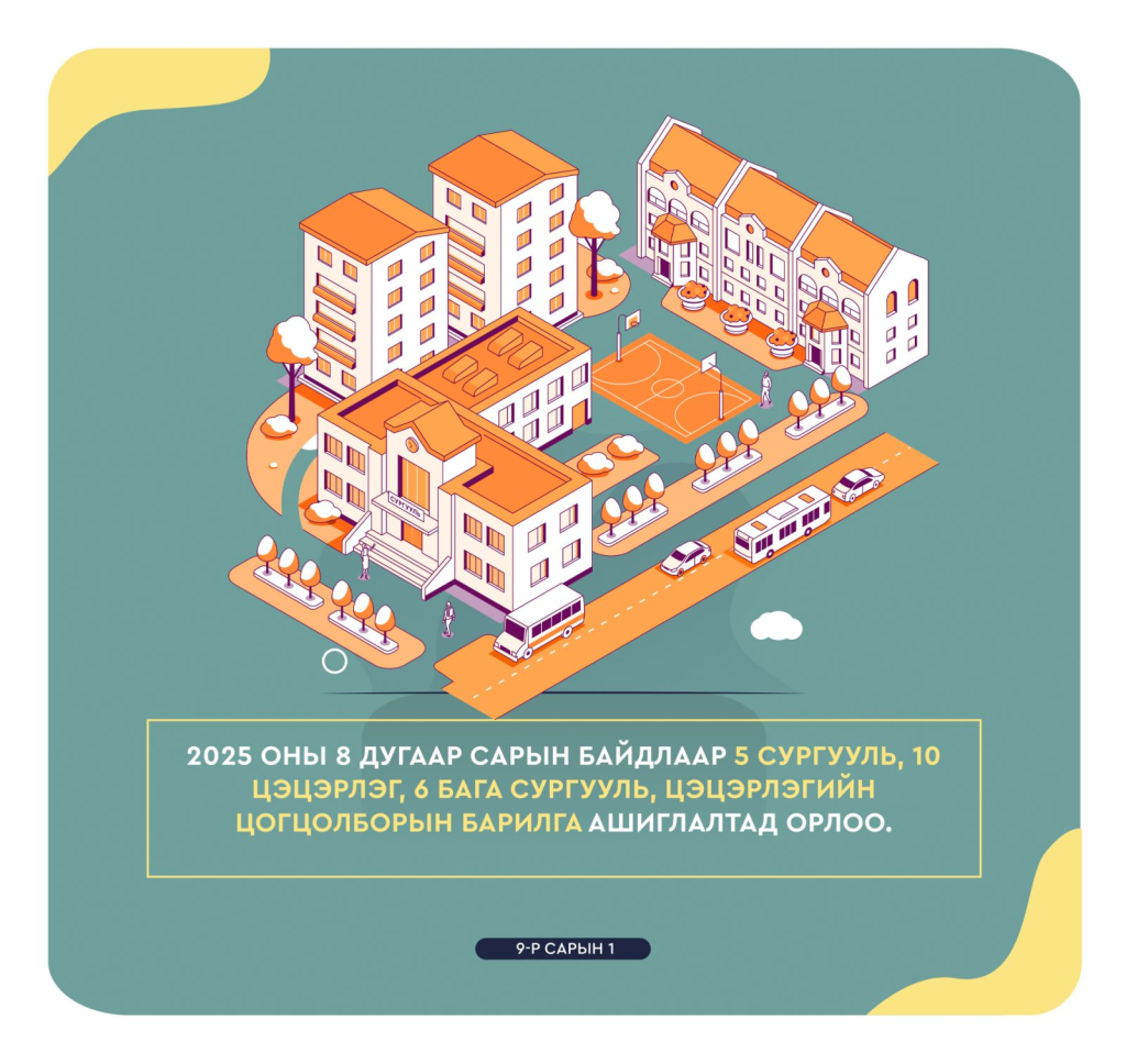 Энэ онд улс, нийслэл, дүүргийн төсөв, гадаадын зээл, тусламжийн хөрөнгөөр 43 сургууль, 67 цэцэрлэг, 22 бага сургууль, цэцэрлэгийн цогцолбор, 7 спорт заал, нийт 139 төсөл, арга хэмжээ хэрэгжиж байна. 2025 оны урьдчилсан төлөвлөгөөгөөр нийт 14 сургууль, 19 цэцэрлэг, 11 бага сургууль, цэцэрлэгийн цогцолборын барилга ашиглалтад орох төлөвлөгөөтэй байна. Үүнээс наймдугаар сарын байдлаар 5 сургууль, 10 цэцэрлэг, 6 бага сургууль, цэцэрлэгийн цогцолборын барилга ашиглалтад орлоо. Нийслэл, дүүргийн төсөв, нийслэлийн орон нутгийн хөгжлийн сан, дүүргийн орон нутгийн хөгжлийн сангийн хөрөнгөөр 2025 онд нийт 177 сургууль, цэцэрлэгийн барилгын их засварыг хийж байна.