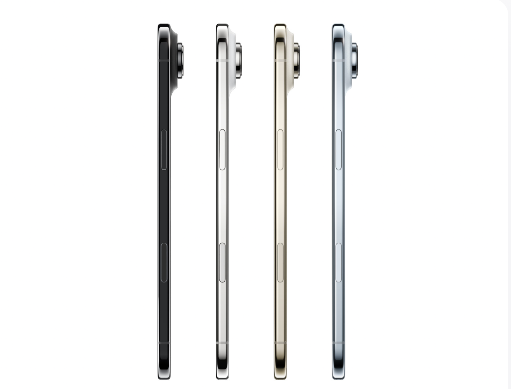 iPhone Air: Хамгийн нимгэн iPhone—5.6мм зузаантай, Grade 5 титан каркас, Ceramic Shield 2 шил, 6.5″ ProMotion дэлгэц (3000 никс), A19 Pro чип, eSIM, нэг 48 MP Fusion камер, 18 MP front камер, All-day батарейтай.