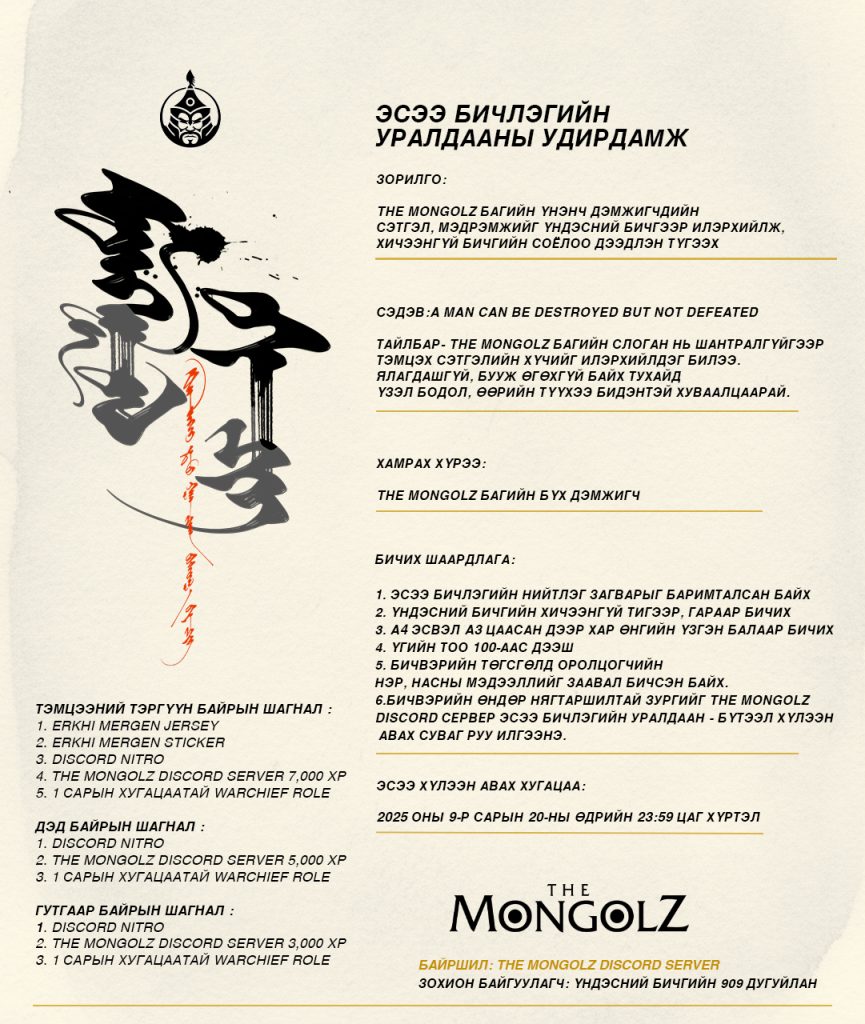 Мөн эсээ бичлэгийн нийтлэг загварыг баримталж А4, А3 цаасан дээр хар өнгийн үзгэн балаар үндэсний бичгийн хичээнгүй тигээр гараар бичнэ. Оролцогчдын бүтээлдээ хувийн мэдээллээ тодорхой бичиж, эсээний зургийг өндөр нягтаршилтай дарж, “The MongolZ” багийн DISCORD сервер хаяг руу илгээх юм байна.