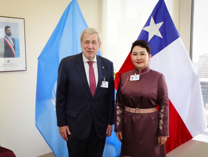 Монгол Улсын Гадаад харилцааны сайд Б.Батцэцэг НҮБ-ын Ерөнхий Ассамблейн 80 дугаар чуулганы Ерөнхий санал шүүмжлэлд оролцох үеэр 2025 оны есдүгээр сарын 22-ны өдөр Бүгд Найрамдах Чили Улсын Гадаад хэргийн сайд Алберт Лео Ван Клаверентэй уулзав.