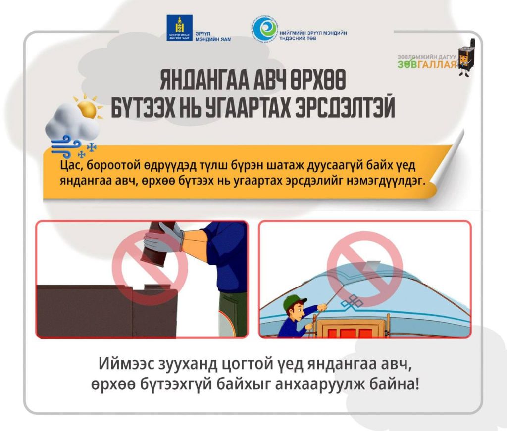 Бороотой өдрүүдэд яндангаа авах, өрхөө бүтээх нь угаарын хийн эрсдэлийг нэмэгдүүлдэг. Угаартах эрсдэлээс сэргийлж бороотой үед яндангаа авч, өрхөө бүү бүтээгээрэй гэж Нийгмийн эрүүл мэндийн үндэсний төвөөс сэрэмжлүүлэв.