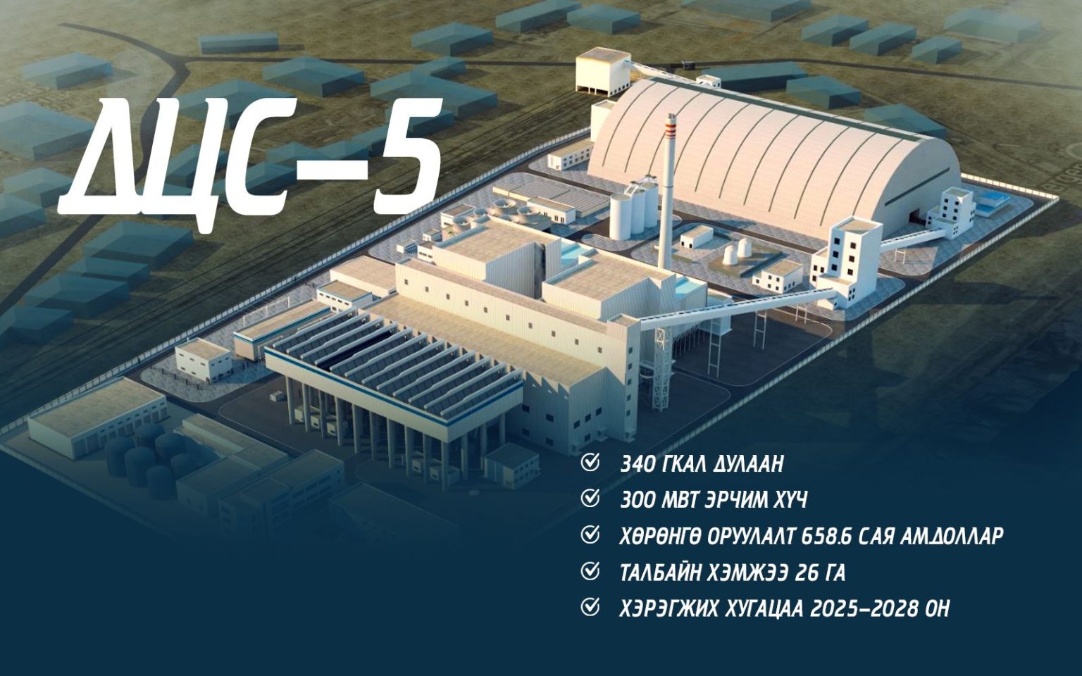 Улаанбаатар хотыг хөгжүүлэх 24 мега төслийн хүрээнд төр, хувийн хэвшлийн түншлэлээр ТЭЦ-5 дулааны цахилгаан станцыг барина. Дулааны тавдугаар цахилгаан станц төслийг Улаанбаатар хотын Баянгол дүүргийн 20-р хорооны нутаг дэвсгэр ДЦС-2-ын үнсэн сангийн талбайн байршилд нийт 26 га газар хэрэгжүүлэхээр төлөвлөөд байна. Тухайн байршлыг сонгох болсон шалтгаан нь харилцаа холбоо, авто болон төмөр замын тээврийн дэд бүтэц сайтайгаас гадна түлш, үнс агуулах талбай нь бэлэн байгааг тооцоолжээ.