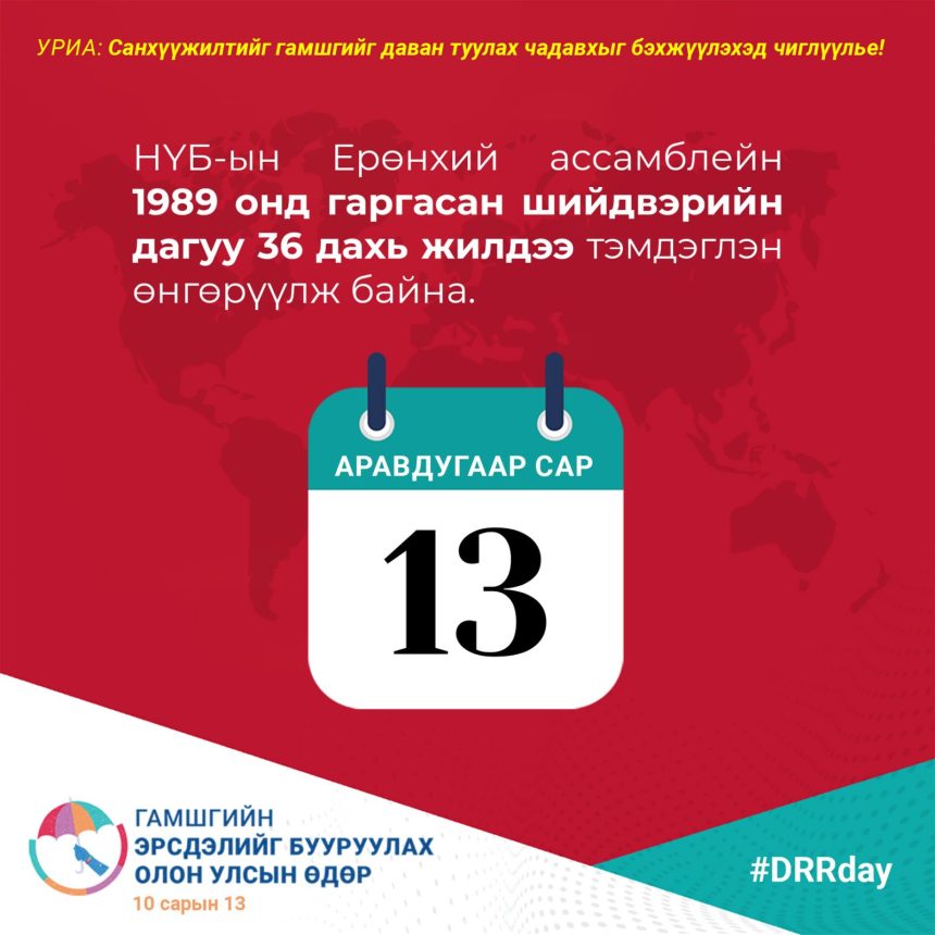 Өнөөдөр буюу 10 дугаар сарын 13. Гамшгийн эрсдэлийг бууруулах олон улсын өдөр. Энэхүү өдрийг НҮБ-ын Ерөнхий ассамблейн шийдвэриийн дагуу 1989 оноос хойш 36 дахь жилдээ тэмдэглэн өнгөрүүлж байна.