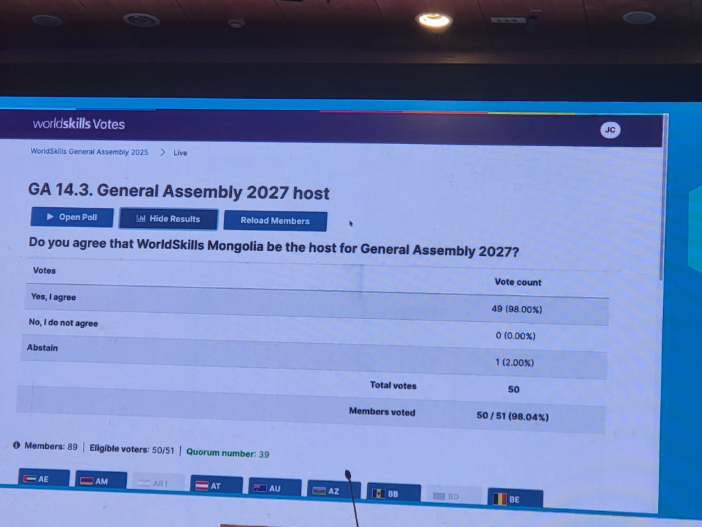Дэлхийн ур чадварын байгууллагад нийт 89 улс албан ёсны гишүүнчлэлтэй байдаг бөгөөд энэ удаагийн ассамблейд 51 гишүүн улс санал өгөх эрхтэйгээр оролцож, Монгол Улсын нийслэл Улаанбаатар хотод зохион байгуулах саналыг 49 гишүүн дэмжсэнээр ийнхүү дэлхийн авьяастнуудын ээлжит цугларалт эх оронд минь зохион байгуулагдахаар боллоо.