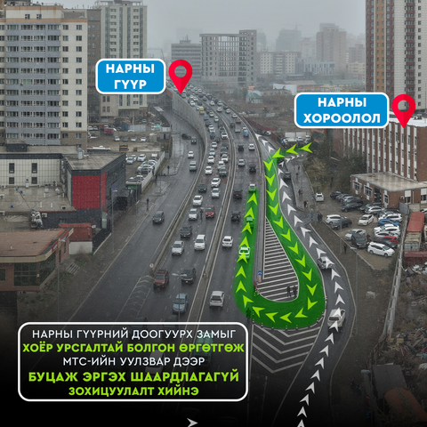 Нарны гүүрний зүүн талын нэг эгнээ замыг өргөтгөх ажил дууссан бөгөөд маргааш буюу 10-р сарын 15-наас нээнэ. Үүнтэй холбоотойгоор “Нарны хороолол” талаас ирэх жолооч нар МТС-ийн уулзвараар буцаж эргэх шаардлагагүй шууд Нарны гүүрний зүүн талаар буцаж эргэх эргэлт хийн хотын төв рүү шууд орох боломжтой.