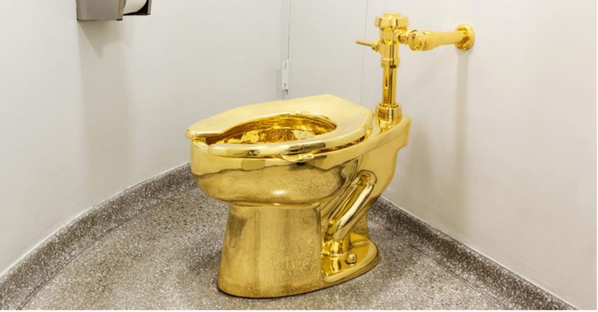 220 фунт жинтэй, 18 каратын цэвэр алтаар хийгдсэн энэхүү бүтээл 2016 онд Нью-Йоркийн Гуггенхайм музейд анх дэлгэгдэж, 100 мянга гаруй үзэгч татаж байв. Гэвч 2019 онд Английн Бленхейм ордноос зэвсэглэсэн этгээдүүд уг бүтээлийг ердөө тавхан минутын дотор хулгайлсан юм. Хулгайчид энэ онд ял авч, хэрэг эцэслэсэн ч, суултуур өнөөг хүртэл олдоогүй байна. Мөрдөгчид бүтээлийг хайлуулж борлуулсан байх магадлал өндөр гэж үзэж байгаа аж.