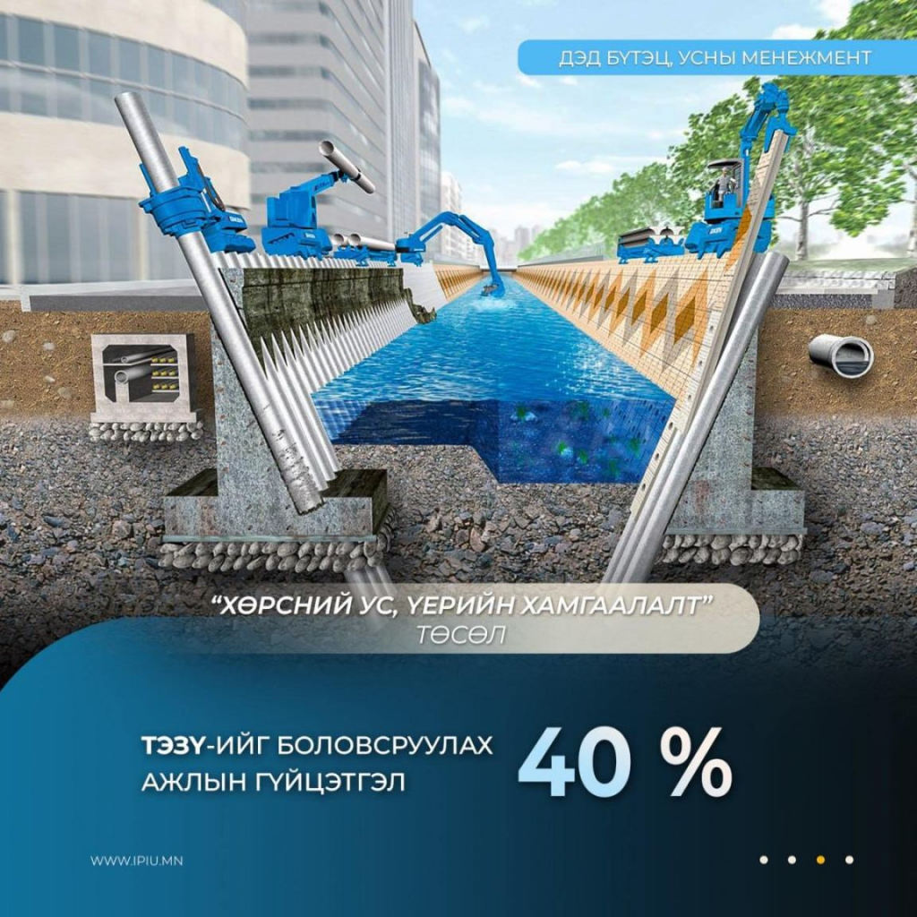 Тиймээс хотын инженерчлэл, дэд бүтцийг сайжруулах хүрээнд “Улаанбаатар хотын инженерийн бэлтгэл арга хэмжээний мастер төлөвлөгөө”-г боловсруулж, үерийн эрсдэлийг бууруулах, голын урсцыг тогтворжуулах, иргэдийн эрүүл, аюулгүй орчинд ажиллаж амьдрах нөхцөлийг бүрдүүлэх, мөн гол дагуух тохижилт болон хотын экосистемийг тэнцвэржүүлэх цогц арга хэмжээг хэрэгжүүлэхээр төлөвлөсөн. Мастер төлөвлөгөөнд нийт 420 гаруй км үерийн байгууламжийг үе шаттайгаар шинээр барихаар тусгасан бөгөөд нэн шаардлагатай байгаа 120 орчим км далан, сувгийг “Хөрсний ус, үерийн хамгаалалтын төсөл”-ийн хүрээнд хэрэгжүүлэх юм. Тодруулбал, нийслэлийн 22 байршилд үерийн хамгаалалтын далан, сувгийг шинэчлэх, сэргээн засварлах, шинээр байгуулахаар төлөвлөсний зэрэгцээ борооны ус зайлуулах шугам хоолойг шуудуу ухалгүйгээр доторлон шинэчлэх дэвшилтэт технологийг нэвтрүүлнэ. Тус төслийн хүрээнд Дэлхийн банкны хөрөнгө оруулалтаар 9 байршилд үерийн хамгаалалтын далан, сувгийн барилга байгууламж, борооны ус зайлуулах шугамыг шинэчилж, өргөтгөх бөгөөд нийт 50.65 км далан, 45.7 км сувгийг байгуулна. Эдгээр 9 байршлын ТЭЗҮ болон Байгаль орчин, нийгмийн нөлөөллийн үнэлгээг “Хот төлөвлөлт, судалгааны институт” ОНӨААТҮГ боловсруулж, одоогийн байдлаар гүйцэтгэл 40 хувьтай үргэлжилж байна.