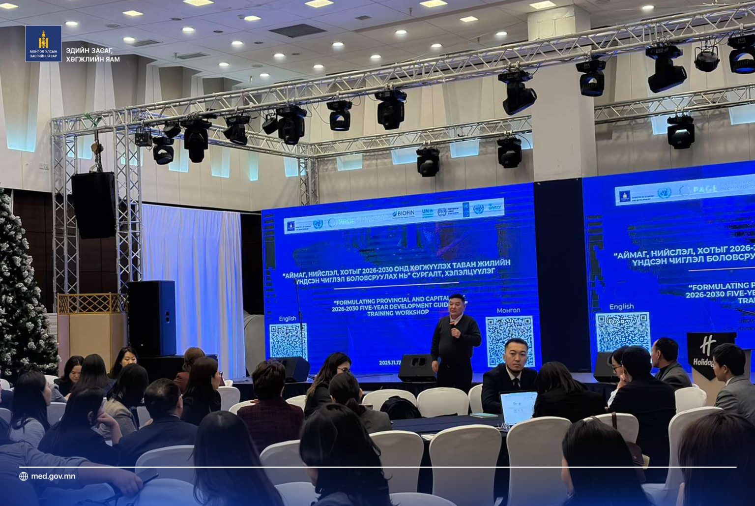 Эдийн засаг, хөгжлийн яам “Аймаг, нийслэл, хотыг 2026-2030 онд хөгжүүлэх таван жилийн үндсэн чиглэл”-ийн төслийг боловсруулах ажлын хүрээнд аймаг, нийслэлийн хөгжлийн бодлого, төлөвлөлтийн чиглэлээр ажиллаж байгаа албан хаагчдад зориулсан мэргэжил арга зүйн зөвлөгөө өгөх сургалт, хэлэлцүүлгийг 2025 оны 11 дүгээр сарын 17, 18-ны өдрүүдэд зохион байгууллаа.