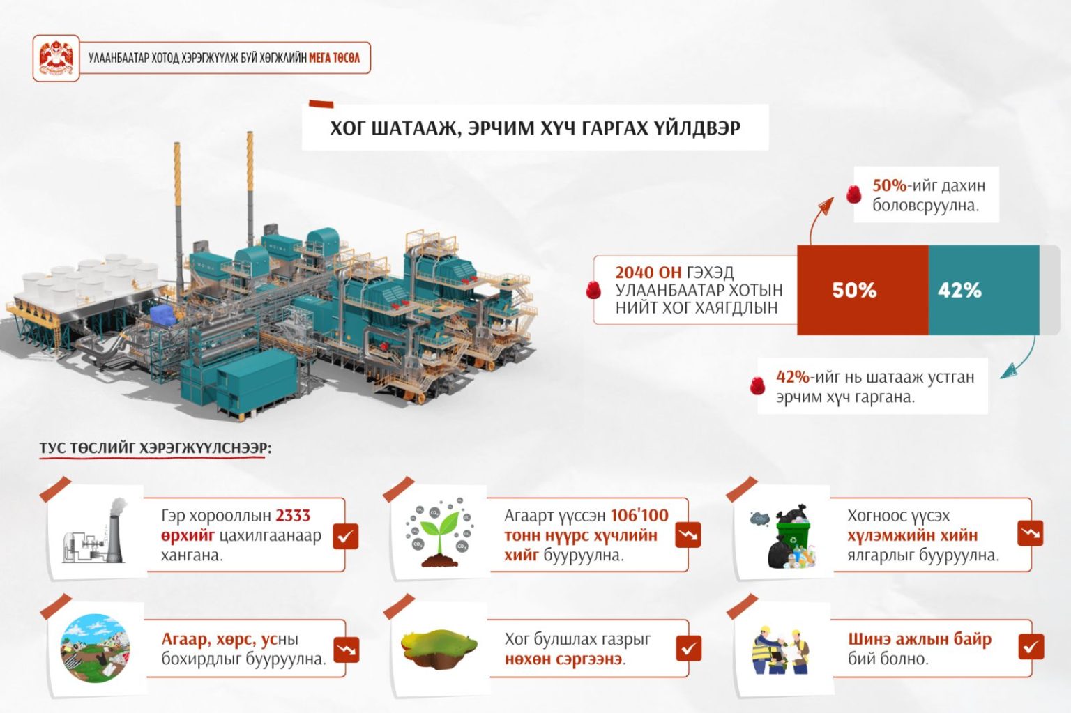 Улаанбаатар хотын хөгжлийн мега төслүүдийн хүрээнд Морингийн даваанд хоногт 1500 тонн хог хаягдал шатааж, 35 МВт эрчим хүч гаргах “Хог шатааж эрчим хүч гаргах үйлдвэр”-ийг 2025-2028 онд барина. Төслийн барилга угсралтын ажлыг төр, хувийн хэвшлийн түншлэлээр 2026 онд эхлүүлэхээр түншлэлийн гэрээг “Рэншоу Сычуань эрчим хүчний хөрөнгө оруулалт, байгаль орчныг хамгаалах” ХХК-тай аравдугаар сарын 24-ний өдөр байгуулсан.