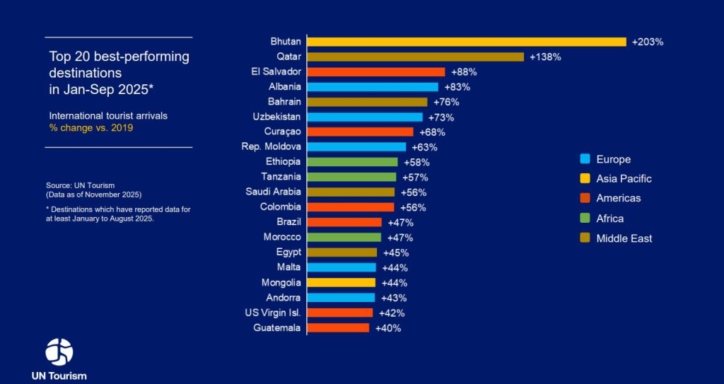 Нэгдсэн Үндэстний Байгууллагын Дэлхийн Аялал Жуулчлалын Байгууллагаас (UN Tourism) сар бүр гаргадаг олон улсын жишиг болох “World Tourism Barometer” тайлангийн 2025 оны арваннэгдүгээр сарын үр дүнгээр Монгол Улс аялал жуулчлалын сэргэлтийн үзүүлэлтээр дэлхийн шилдэг 20 улсын тоонд албан ёсоор багтлаа.
