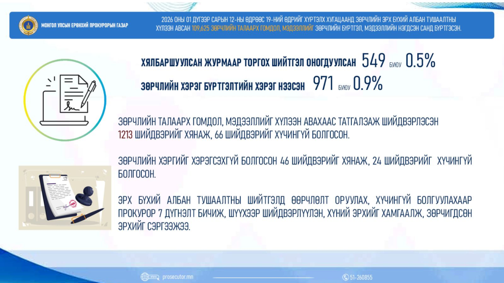 Прокурорын байгууллага 2026 оны 01 дугаар сарын 12-ны өдрөөс 2026 оны 01 дүгээр сарын 19-ний өдрийг хүртэл хугацаанд улсын хэмжээнд зөрчил шалган шийдвэрлэх эрх бүхий албан тушаалтны хүлээн авсан 109,625 зөрчлийн талаарх гомдол, мэдээллийг зөрчлийн бүртгэл, мэдээллийн нэгдсэн санд бүртгэсэн байна.