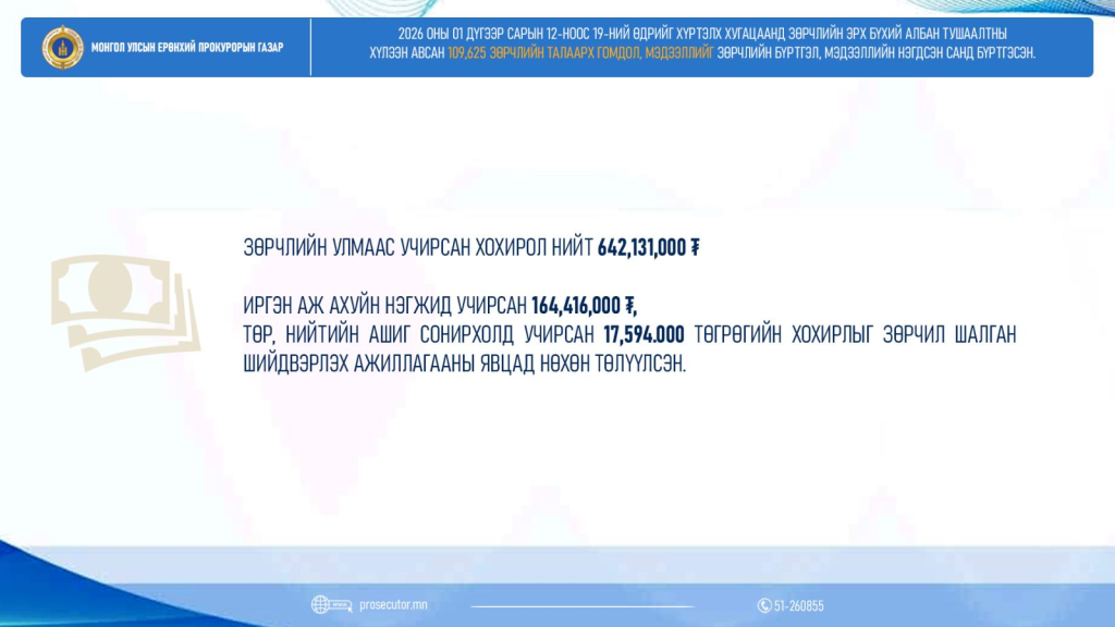 Зөрчлийн улмаас нийт 642,131,000 төгрөгийн хохирол учирснаас 164,416,000 төгрөгийн буюу 25.6 хувийг, үүнээс төр, нийтийн ашиг сонирхолд учирсан 17,594,000 төгрөгийн хохирлыг зөрчил шалган шийдвэрлэх ажиллагааны явцад нөхөн төлүүлжээ.
